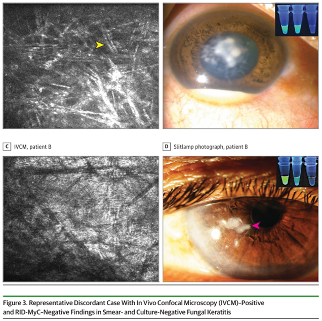 The results of this index study continue to affirm the complementary value of molecular tools in diagnosing fungal infections. IVCM is not readily available in many places, and in one-third of patients, it is not feasible, probably due to poor patient cooperation or clinical contraindications. In addition, the short turnaround time of ST-RID-MyC compared with cultures is vital for the prompt initiation of appropriate antifungal therapy and invariably improves treatment outcomes. Conclusively, the authors suggest the use of RID-MyC as an adjuvant, especially when conventional methods fail.