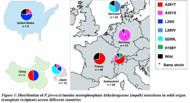Una mayor comprensión del tema se obtuvo en un estudio observacional retrospectivo internacional multicéntrico, de Liang Ma et al, en el cual el gen IMPDH de P.jirovecii fue secuenciado en muestras tomadas de 96 pacientes con TOS (94 de nueve brotes diferentes y 84 bajo tratamiento con MPA) y 67 controles no transplantados (ninguno en tratamiento con MPA), y se realizó modelado computacional para predecir los efetos de las mutaciones de la IMPDH en la estructura de la proteína y la unión de MPA. Se identificaron seis mutaciones en el gen IMPDH de P.jirovecii (H108Y, A261T, A261S, L285I, L285V, and Q289L), de las cuales cinco (A261T, A261S, L285I, L285V, and Q289L) se asociaron fuertemente con la condición de TOS y la exposición a MPA. Este estudio también reveló que cuatro de las seis mutaciones estaban, cada una, asociadas a mútiples cepas diferentes; el modelado estructural predijo que cuatro mutaciones reducían la estabilidad de la proteína y la afinidad de unión al MPA.