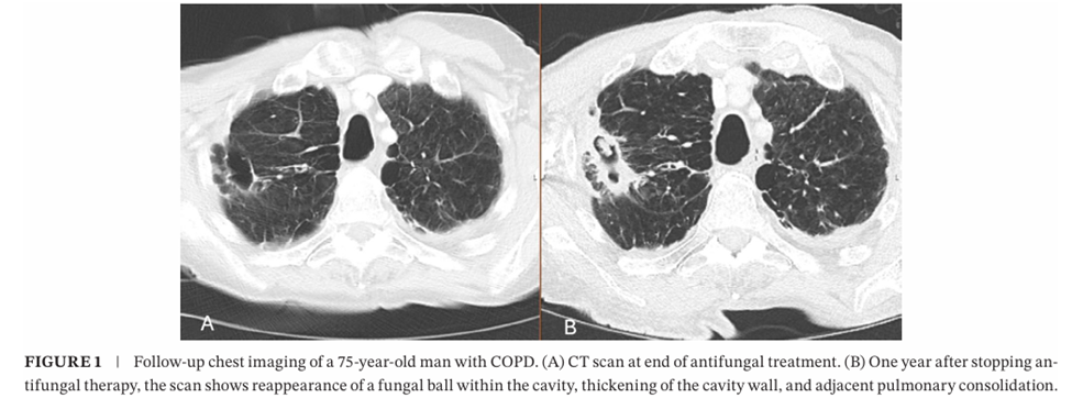 Clinically, relapse can be subtle, with minimal worsening of symptoms, but significant radiological or lung function changes. Follow-up, therefore, needs to encompass imaging, Aspergillus IgG titre, lung fungal and sputum fungal culture.